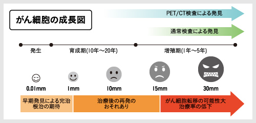 癌が、直径10mmになるのには約10~20年かかります。この時期を過ぎると急激に増殖し、手遅れになる可能性があります。これまで小さくて発見が困難とされていた癌でも、この先端PET-CTなら10mmでも発見が可能になりました。